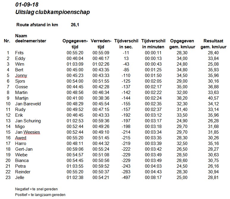 Op zaterdag 1 september jl. hebben onder prachtige weersomstandigheden, zonnetje en niet veel wind, 23 leden van onze club het jaarlijkse clubkampioenschap tijdrijden gereden. De rit wordt zoals elk jaar gefietst van en naar Roodehaan. Winnaar is geworden Frits Zijlstra, 2e Eddy Lanting en 3e Wim Jansen. Na de prijsuitreiking hebben we gezamenlijk de ochtend afgesloten met koffie en appeltaart bij Camping Roodehaan.