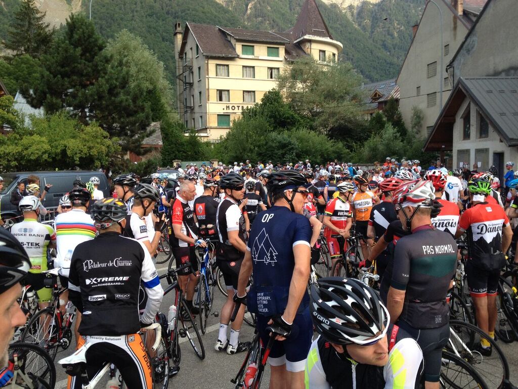 Het is 4 juli 2015, kwart over zeven ’s ochtends, en ik sta op een plein in Bourg d’Oisans te wachten tot ik los mag voor de Marmotte Cyclo. Om me heen hoor ik Engels, Deens, Frans, en Nederlands met een Vlaams accent. De laatste keer dat ik hieraan mee deed was nog de helft van de deelnemers Nederlands, maar nu spot ik nauwelijks landgenoten. Ik start in de tweede groep, wat betekent dat we netjes om 7:30 uur worden weggeschoten. Het is al de hele week bloedheet, en ook vandaag belooft het weer een warme dag te worden. Elf jaar geleden deed ik ook al eens mee. Toen mijn vrouw na afloop vroeg hoe het ging was mijn antwoord: eens maar nooit weer. Vier Alpencols op 1 dag, met in totaal ruim 5000 hoogtemeters: het is een beetje veel van het goede voor ons laaglanders. Maar het kriebelde alweer een tijdje. Zo had ik de afgelopen jaren drie keer de Mont Ventoux beklommen op 1 dag (ook ongeveer 5000 hm), en twee keer de limiet voor goud gehaald in de Trois Ballons (een cyclo in de Vogezen, 200 km en 4000 hm), dus toen deze winter mijn schaatsmaat Wander voorstelde de Marmotte te gaan doen, was ik snel om.