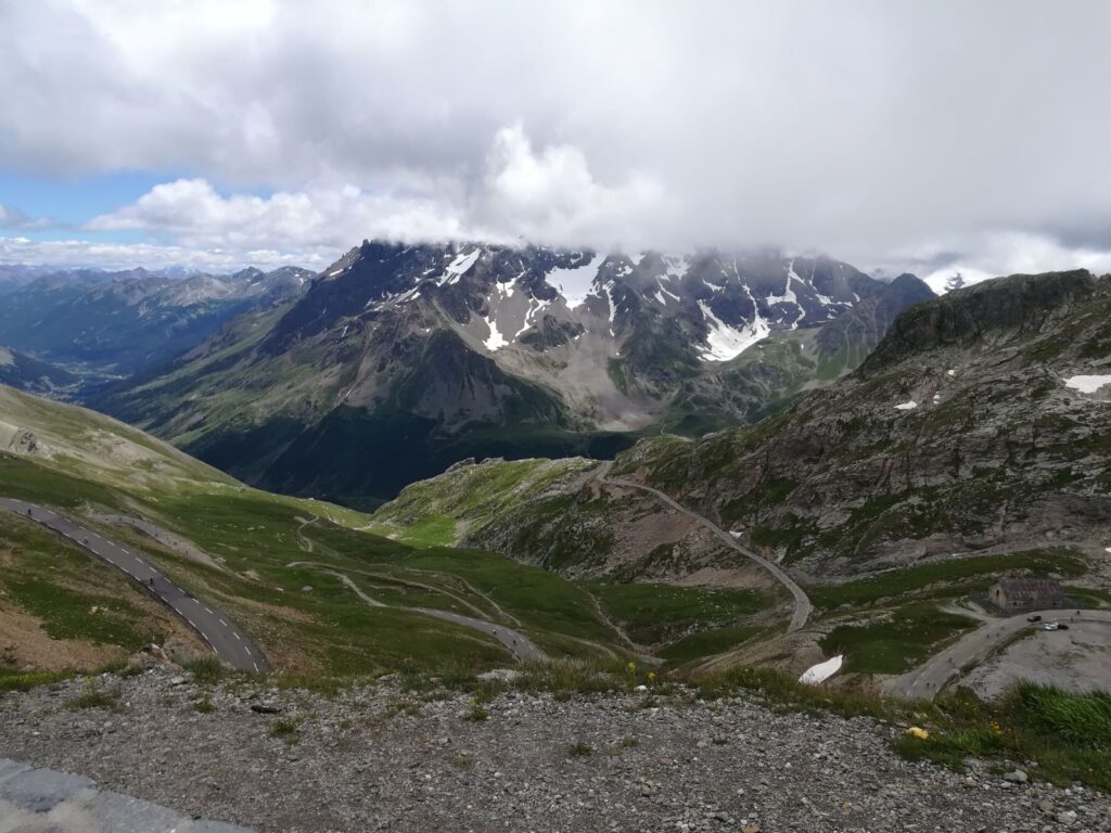 Nadat ik op de top van de Telegraphe de verzorging links laat liggen en afdaal richting Valloire zit in helemaal alleen. Net voor de voet van de Galibier sla ik bij de volgende ravitailleringspost flink wat eten en drinken in en prop ik alles wat eetbaar is naar binnen. Gauw weer op de fiets en me mentaal voorbereiden op de saaie lange Galibier. Met 18,1 km tegen 6,9% en het steilste stuk (>10%) nabij de top, een col van formaat. Langzaam maar zeker komt het einde van de klim van deze puinbult dichterbij en ben ik na ruim 1,5 uur boven. Het is dan nog steeds bewolkt, mistig en koud. Bovenop waait het ook nog eens stevig en grijp ik nog wat eten en vul de bidons bij.