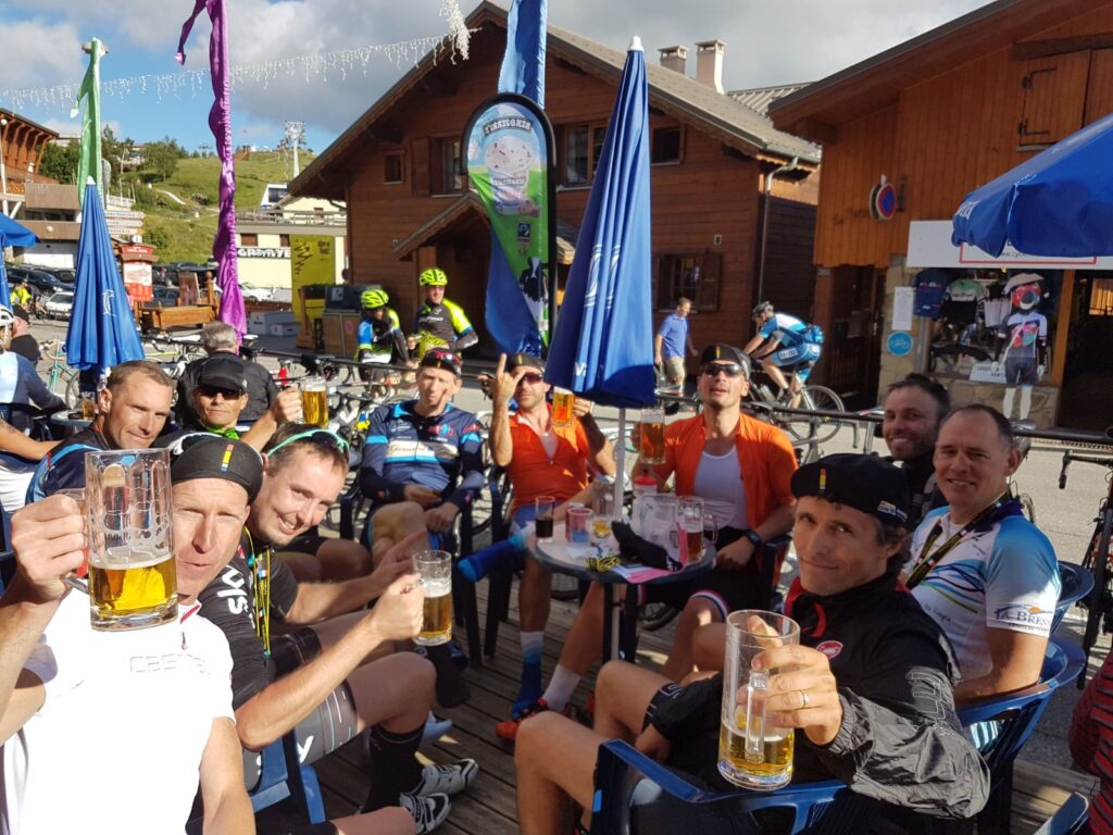 Zaterdag volgt een rustdag. ’s Morgens wordt het materiaal gereedgemaakt voor de dag van morgen. ‘s Middags borrelen we in het centrum van Le Bourg d’Oisans, waar het ondertussen gezellig druk is met fietsers. Na een ‘grand’ Hoegaarden is het tijd om thuis een goede pastamaaltijd te prepareren. John biedt zich opnieuw aan en ook deze keer laat het zich prima smaken. ’s Avonds is iedereen druk met het organiseren en klaarzetten en worden de laatste puntjes op de ‘i’ gezet. Voor Oene, Jeroen en Gosse gaat de wekker vroeg. Zij starten in de eerste groep van 7.00u. De rest laat zich om 7.50u wegschieten. Het is dan ook op tijd stil in Le Rive. Maar de slaap vatten wil bij mij nog niet. Toch spanning voor morgen?