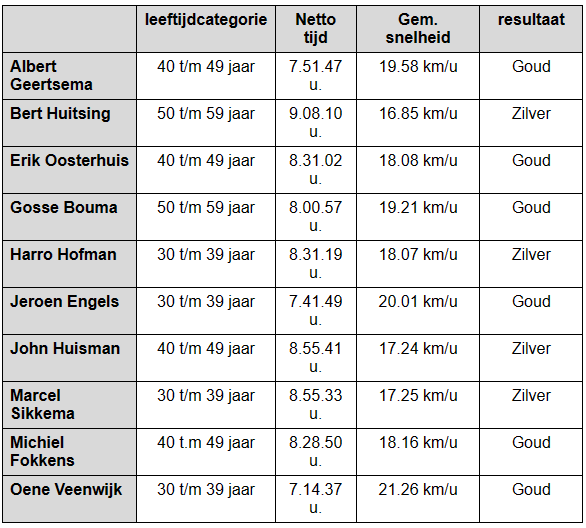 Nadat we een pastamaaltijd genuttigd hebben halen we ons certificaat en medaille op. Michiel, John en Marcel zijn inmiddels ook binnen. Het wachten is op Bert. Maar ook die stelt niet teleur en volgt kort daarna. Op het terras wordt geproost op een geweldig resultaat. Nadat we afgedaald zijn richting Le Rive, eten we ’s avonds heerlijke ravioli bij de ‘buren’ en wordt er nog lang nageborreld. De volgende ochtend wordt de thuisreis aanvaard en komt er een einde aan een geweldige week in Frankrijk met dito resultaat. 6 keer goud en 4 keer zilver. Een resultaat die ruimte laat voor verbetering want voor het goud kom ik graag nog een keer terug! Het was genieten! Iedereen bedankt voor de geweldige trip en Jeroen heel veel succes bij de Marmotte Grandfondo Pyrénées eind augustus. Met 163km en 5600 hoogtemeters nog wat pittiger! Hieronder vind je een overzicht van de tijden.
