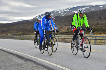 Zodra we op de E6 zijn aangeland sluit ik me aan bij een groepje in het wit geklede Peuqot mannen. Zoals gewoonlijk is het begin hectisch, de snelheid varieert enorm. Na 40 minuten heb ik er genoeg van, het oude lijf trekt al die tempowisselingen niet meer. In mijn eentje ga ik rustig in mijn eigen tempo verder. Dit bevalt me beter, zo rij ik rustig naar Soknedal naar de eerste verzorgingspost. Kom ongeveer tegelijk met Mirjam aan. Een broodje, uit Warffum, naar binnen werken dan handschoenen aan en mijn regenjack, dan verder. Hoewel het niet zo koud is als een jaar eerder voel ik gek genoeg de kou pas als ik na 120km in Oppdalsporten, de 2e stop, in een cafetaria in de warmte kom. Na en kop thee, weer verder, het is inmiddels iets na half vier in de morgen. De aanloop naar de hoogvlakte vind ik het mooiste deel van de route. Op de hoogvlakte kun je van alles verwachten, windstil, storm, intense kou, regen, sneeuw. Zelfs in de zomer ligt de sneeuw langs de weg. Nu is het nog circa 30km klimmen om op het hoogste punt van de Dovre hoogvlakte te komen. Dan wordt het vlakker. Gelukkig, geen wind tegen. Wat is het mooi hier en rustig. Met een tweetal deelnemers ga ik de lange afdaling naar Dombas in.