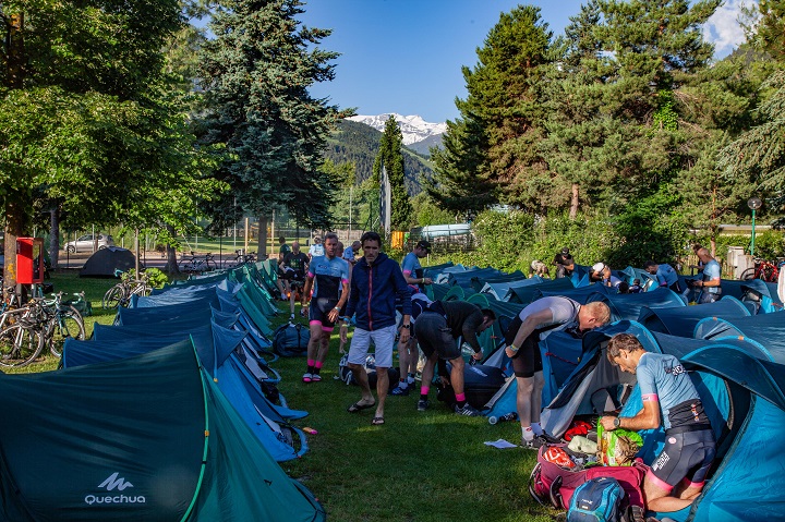De start van een etappe en de finish van een etappe zijn steeds op een camping. Hier staan bij aankomst alle tentjes al klaar, is er direct een herstelmaaltijd en herstelshake voor je ter beschikking en rond half 7 kan je aanschuiven voor een uitgebreid diner. Het is allemaal perfect geregeld door de organisatie. In de ochtend staat er een ruim ontbijt klaar en de sportdrank en repen, gelletjes zijn voor het grijpen. Onderweg zijn er steeds 2 verzorgingsposten, waar voldoende eten en drinken is. Maar liefst 150 vrijwilligers zorgen ervoor dat je volledig in een bubbel kan zitten. Eat, sleep, race, repeat. Zo ook de tweede etappe. 145 kilometer en 3200 hoogtemeters. De Albullapass, Lenzerheidepass en Glaspass moeten bedwongen worden. Michiel en Albert zorgen ervoor dat ze weer aanhaken bij de kopgroep, Ronald en Marcel doen het vandaag iets rustiger aan. Op een lekke band van Ronald in de afdaling, inclusief kleine schuiver na is het een prachtige fietsdag en is iedereen vroeg binnen, zodat er tijd is om wat te genieten.