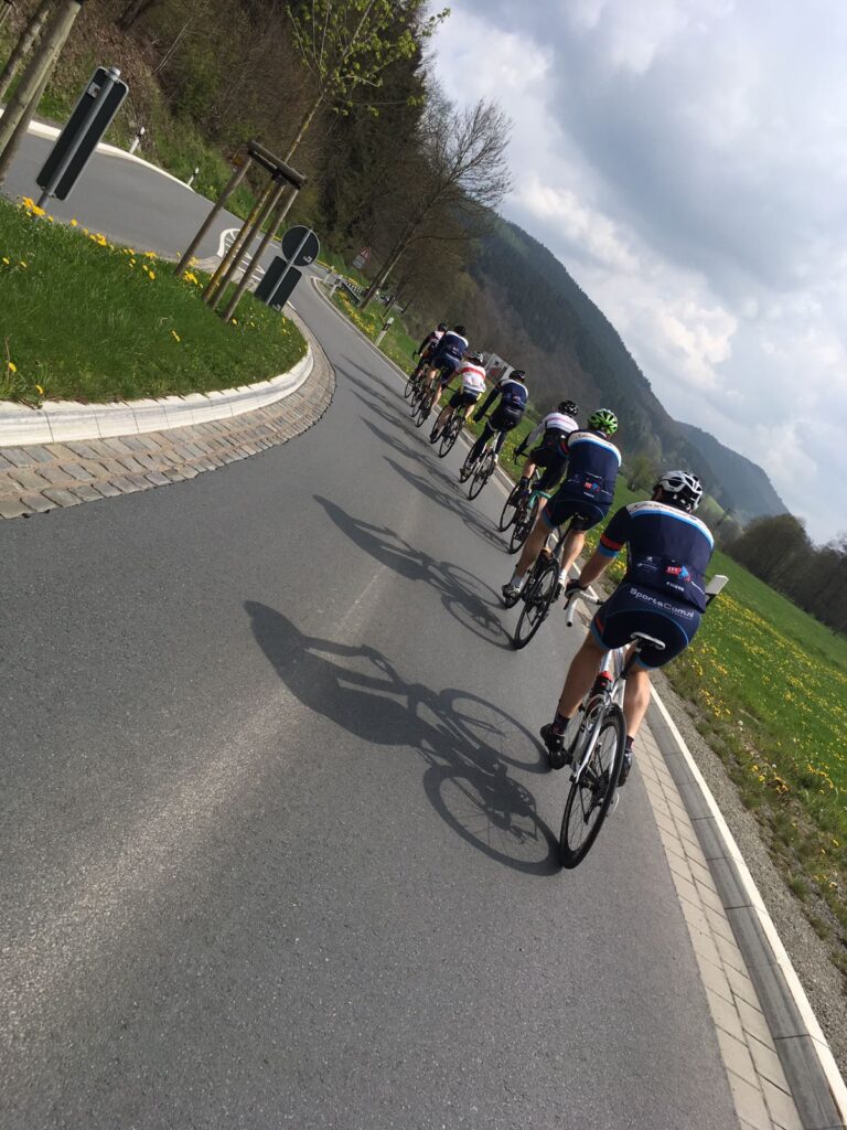 Nadat iedereen zich geïnstalleerd en omgekleed heeft, is het tijd voor de eerste training. Omdat de groep vrij groot is, wordt besloten om de groep in tweeën te splitsen. Een ‘snelle’ en een wat ‘minder snelle’ groep. Ikzelf mag samen met nog 8 man deelnemen aan de snelle groep. In dit verslag zal de nadruk dan ook op die groep liggen. Onder leiding van Eppe rijden we richting Winterberg en pakken we de eerste echte hoogtemeters (5 km tegen gem. 4%). Vervolgens dalen we af richting Elkeringhausen en dient de tweede serieuze klim (tot. 14%) zich aan. Het wordt duidelijk dat we een paar echte klimgeiten in de ploeg hebben. Dit resulteert in mijn eerste en tevens laatste poging om aan te haken bij de ‘elite’. Oftewel, ik mag me nestelen in de middenmoot. Na deze felle klim volgt er een lange afdaling met wat stukken vals plat. Er wordt flink doorgereden tot het klimmetje bij het gehucht Hesborn (2km tegen gem. 5%) waarna een heerlijke afdaling richting Liesen volgt. Daar wordt even op elkaar gewacht en met de hele groep rustig uitgereden richting Züschen. Met 60 kilometer, 800 hoogtemeters en een gemiddelde van ruim 31 km/u een pittige eerste rit.