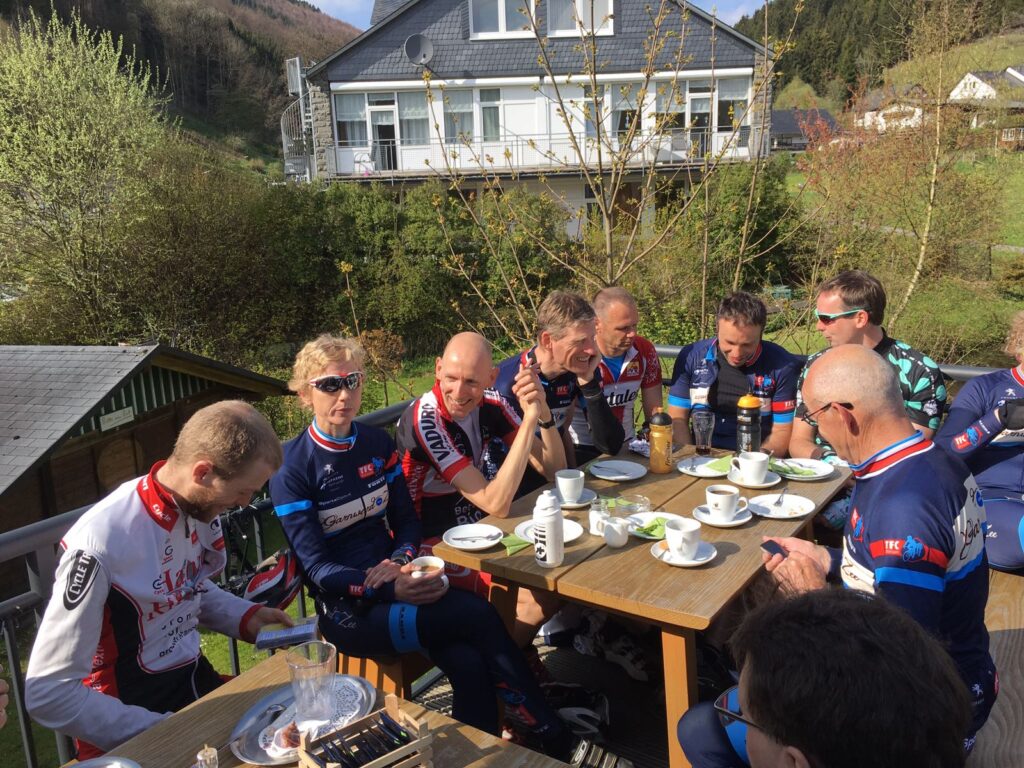 Rond 14.30u wordt door beide groepen afscheid genomen en vertrekken we voor een nieuwe serie pittige klimmetjes in de schitterende omgeving van Winterberg. Als eerste komen we aan bij de voet van de klim tussen Züschen en Mollseifen. Met een lengte van ruim 3 kilometer tegen 4,5% een oude bekende. Na de heerlijke afdaling en een tiental kilometers vals plat arriveren we in Wingeshausen. Daar wacht de schitterende klim richting het pittoreske Jagdhaus. Een pukkel van bijna 6 kilometer en een gemiddeld stijgingspercentage van 3,5%. Inmiddels laat de ochtendsessie zich niet onbetuigd en begint de verzuring alarmerende vormen aan te nemen. Dus een tandje terug en in alle ‘rust’ genieten van de mooie omgeving. Eenmaal boven nemen we even de tijd om op adem te komen en genieten we van het zonnetje. Er volgt een mooie gelijkmatige afdaling richting Fleckenberg en nog wat licht klimwerk naar de koffiestop in Oberkirchen. ‘Der Mann mit dem Hammer’ zit me inmiddels danig op de hielen en de koffie komt voor mij geen minuut te vroeg. In Gasthaus Lennemühle worden we, zoals elk jaar met open armen ontvangen en genieten we van Kaffee und Kuchen. Na de eerste ‘emmer’ koffie schuift ook de andere groep aan en wordt er gezellig bijgepraat.